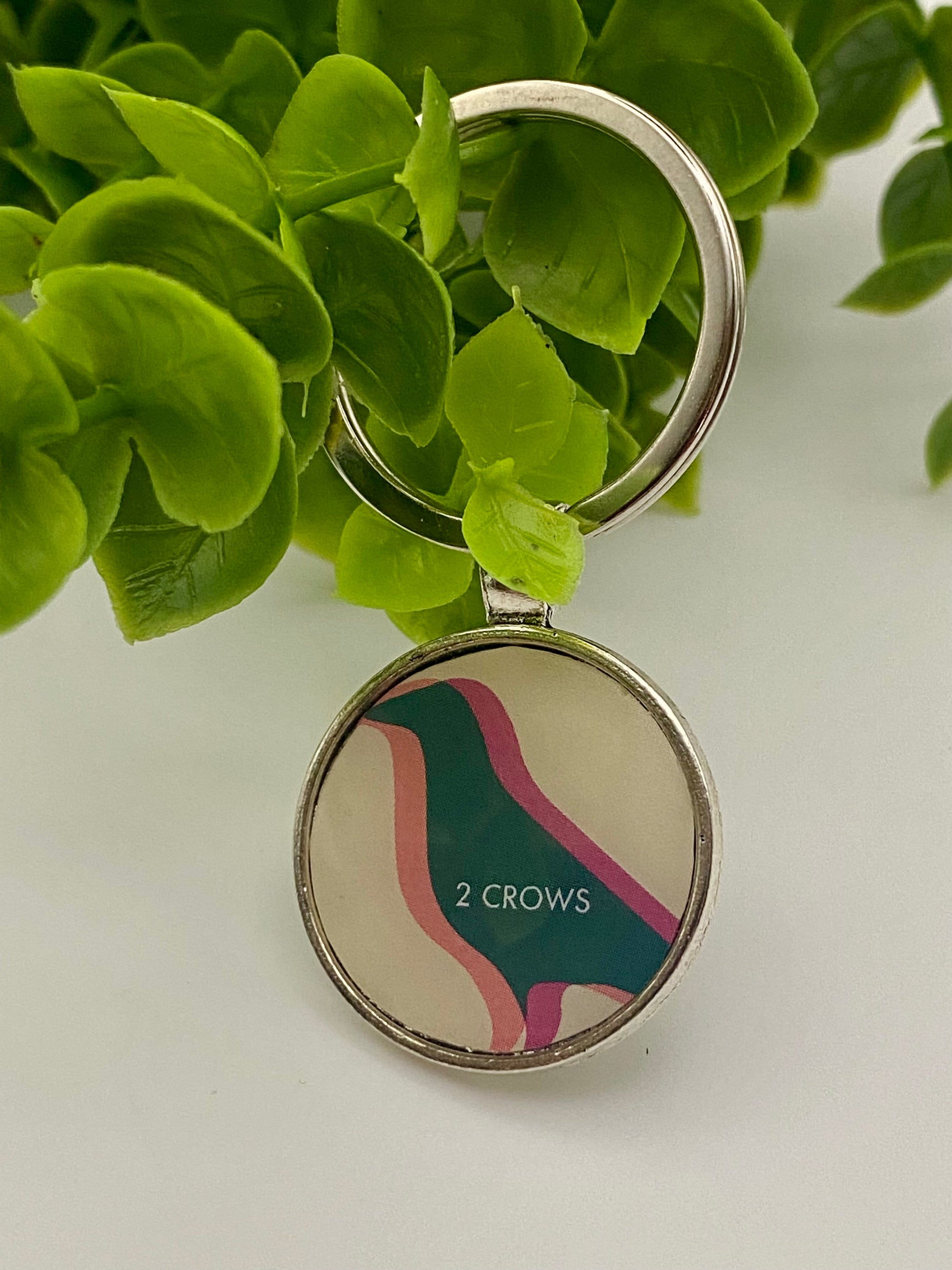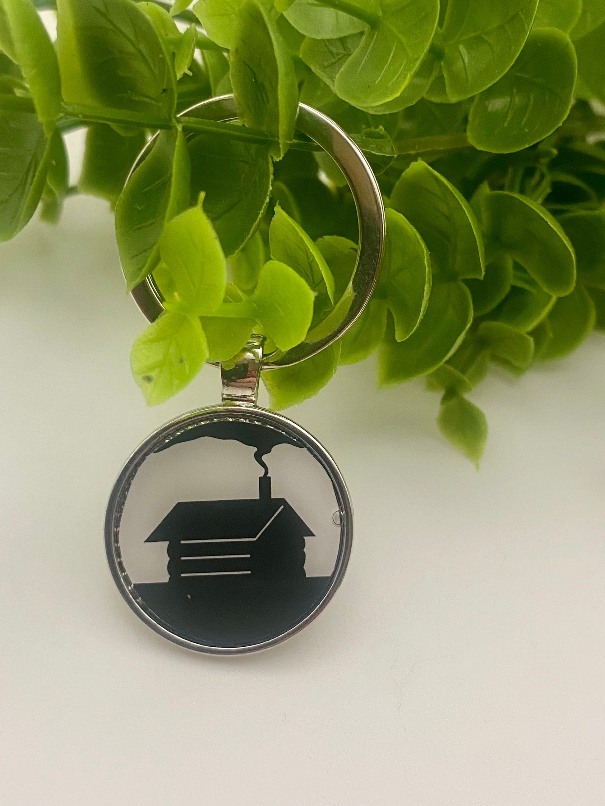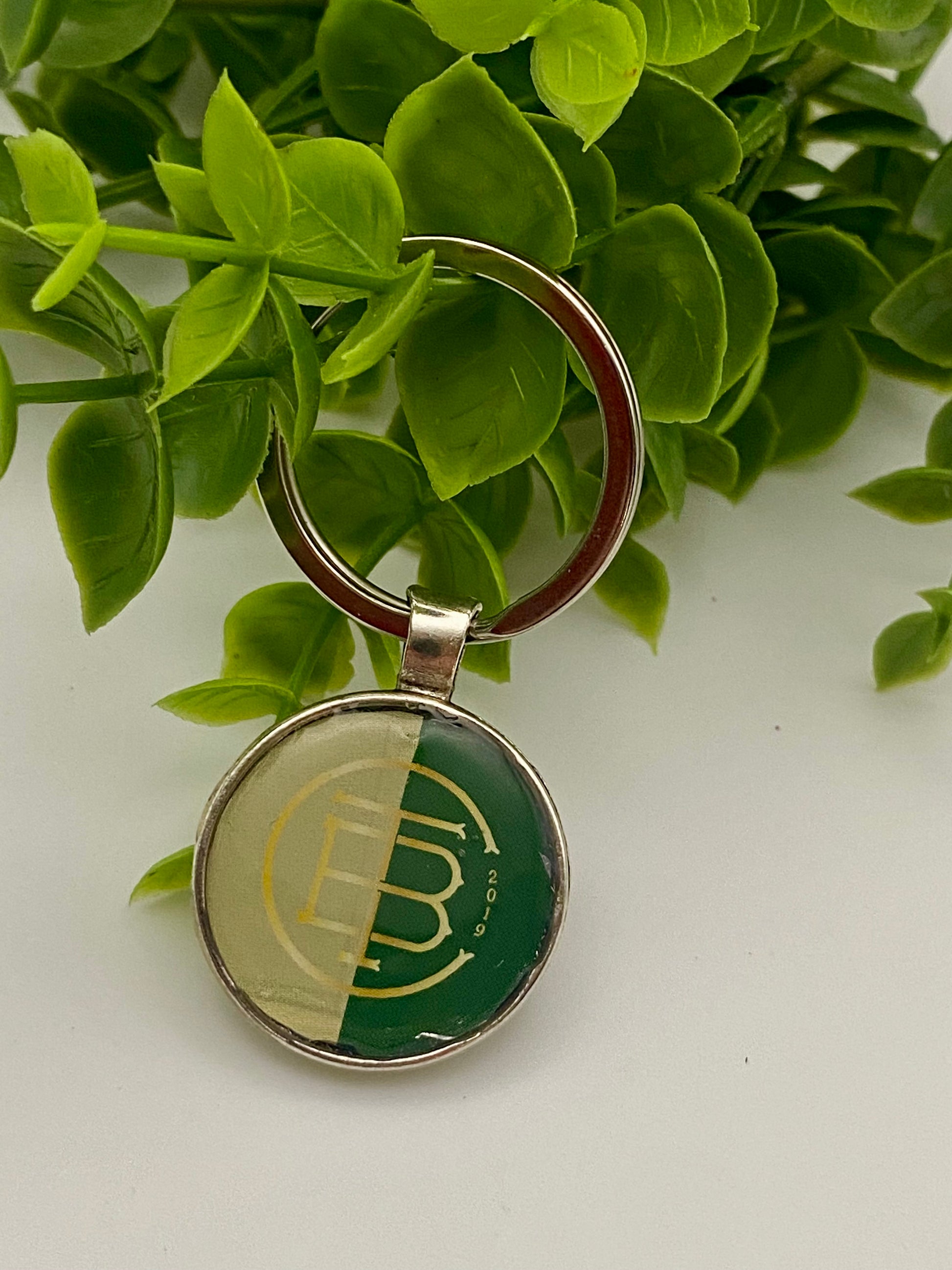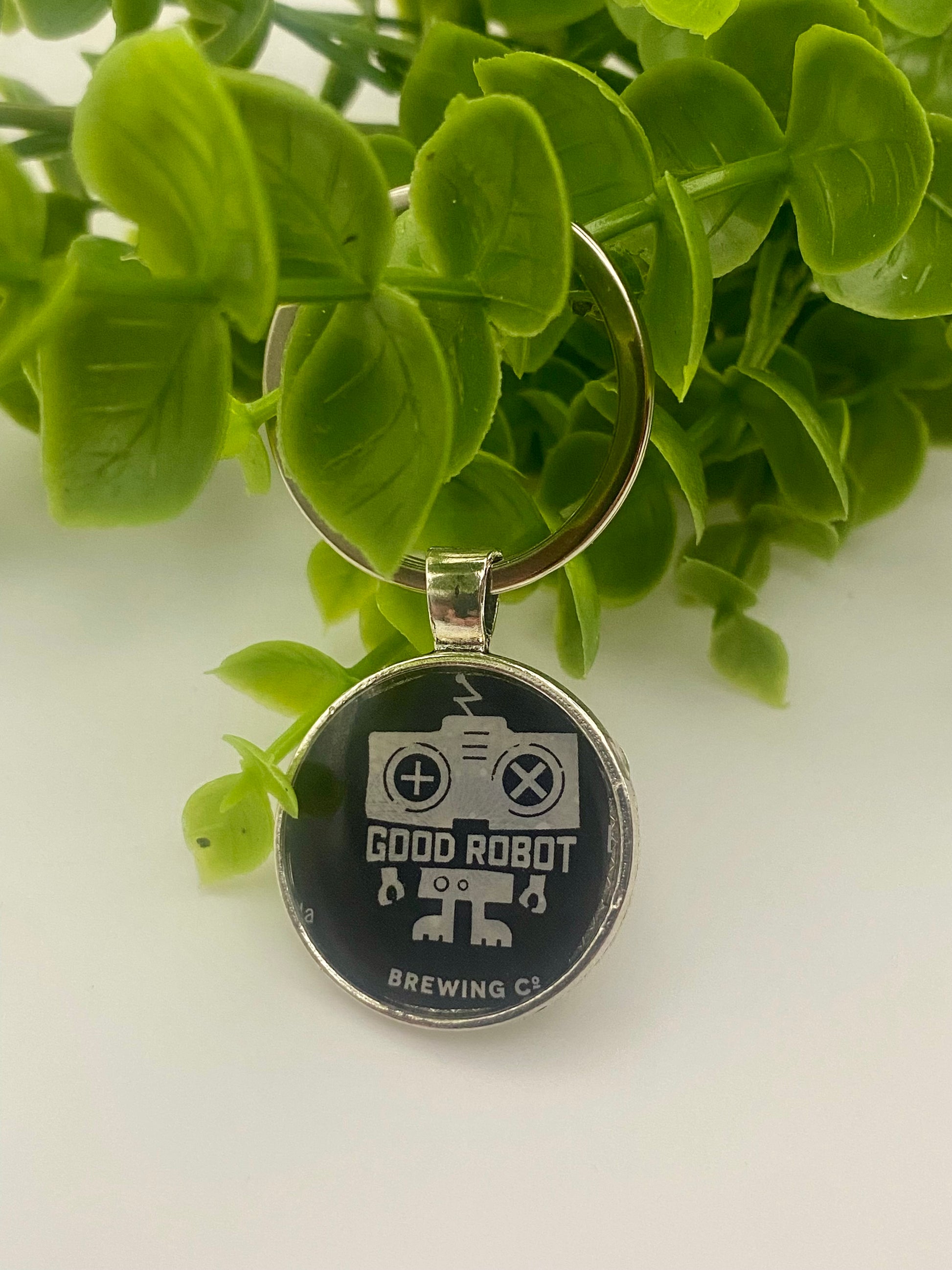 Beer can is cut and placed inside of a stainless steel keychain bezel and covered in UV resin.